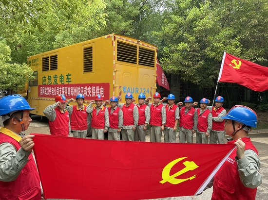 为加强支援队伍领导力和凝聚力,国网湖北电力党委组织援豫支援队共111名正式党员,成立临时党委和4个临时党支部,组建18支共产党员突击队,发出了“坚决听党号令,践行初心使命;传承优良作风,亮出铁军风采;科学抢险救灾,保证安全健康;维护和谐稳定,凝聚强大合力”的工作倡议,引导全体援豫党员将抗洪救灾保电现场作为检验党史学习教育成果的“主战场”,开展主题党日活动,并将安全日活动和党小组学习相结合,激励员工、鼓舞士气,提高队伍战斗力。